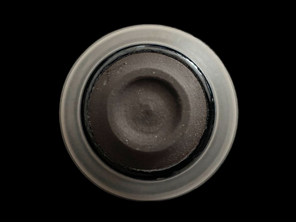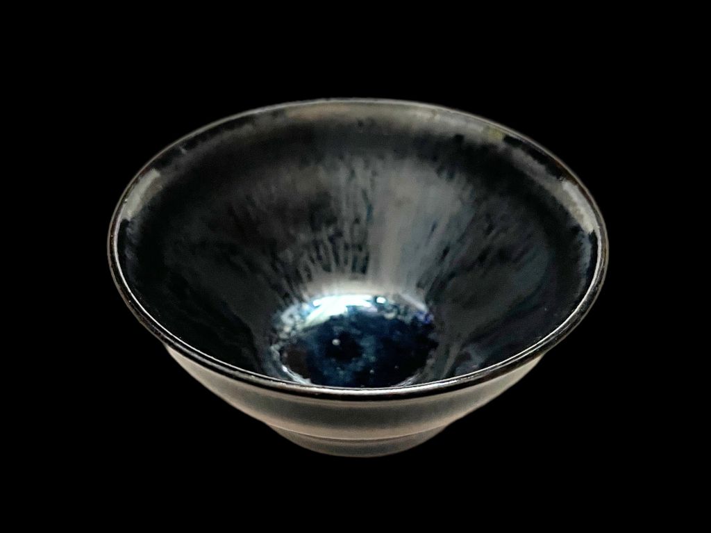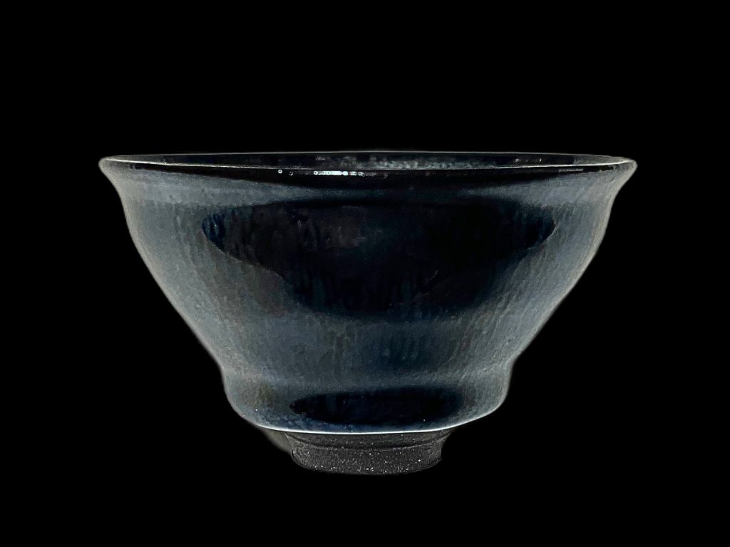 黒色の陶土に深い青色の釉薬が焼成された窯変天目の作品です。